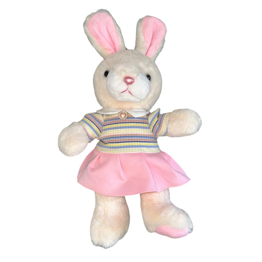 Coelha de pelucía branca com camisa colorida listrada e saia rosa