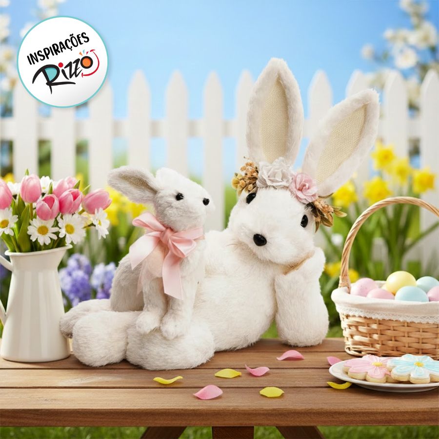A Coelha Decorativa Deitada com Filhote é uma encantadora peça que transmite uma atmosfera de carinho e ternura. Esta coelha está deitada e exibe uma graciosa coroa de flores na cabeça, adicionando um toque delicado e festivo à sua figura. Em seu colo, repousa um adorável filhote de coelho, que usa um laço rosa, acrescentando um charme adicional à cena.