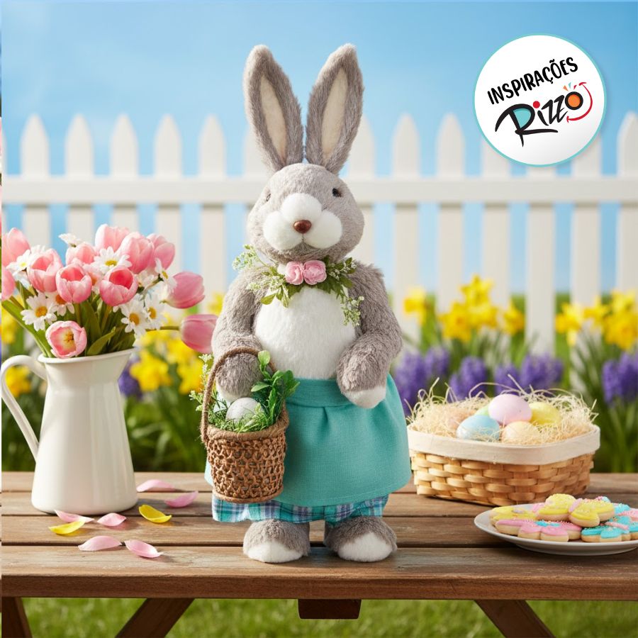 A combinação de tons verde-água, branco e cinza na saia e no colar de flores proporciona uma estética suave e harmoniosa. A presença da cesta de ovos completa o visual, acrescentando um toque autêntico e remetendo à tradição da Páscoa. Esta Coelha Decorativa Grande é perfeita para ser exibida como um ponto focal em ambientes como prateleiras, mesas ou como parte de uma decoração temática. Uma escolha encantadora para celebrar a chegada da primavera e a alegria da Páscoa.