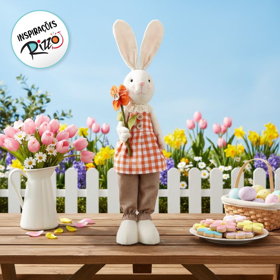 O destaque desta peça é a coelha segurando uma flor laranja, adicionando um toque de cor e vitalidade à decoração. Coloque esta coelha em pé em áreas estratégicas da casa, como sala de estar, hall de entrada ou varanda, para criar uma atmosfera acolhedora e festiva. O xadrez colorido e a presença da flor fazem deste coelho decorativo uma escolha encantadora para a temporada de Páscoa e além, proporcionando uma sensação de alegria e renovação.
