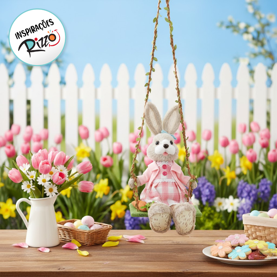A escolha da cor rosa no vestido contribui para uma estética suave e feminina, transmitindo uma atmosfera de delicadeza e charme. Pendure esta Coelha Decorativa em áreas como varandas, jardins, ou em espaços internos para criar um ponto focal encantador. A imagem da coelha no balanço evoca uma sensação de tranquilidade e doçura, tornando esta peça uma adição encantadora à sua decoração, especialmente para aqueles que apreciam elementos fofos e alegres.