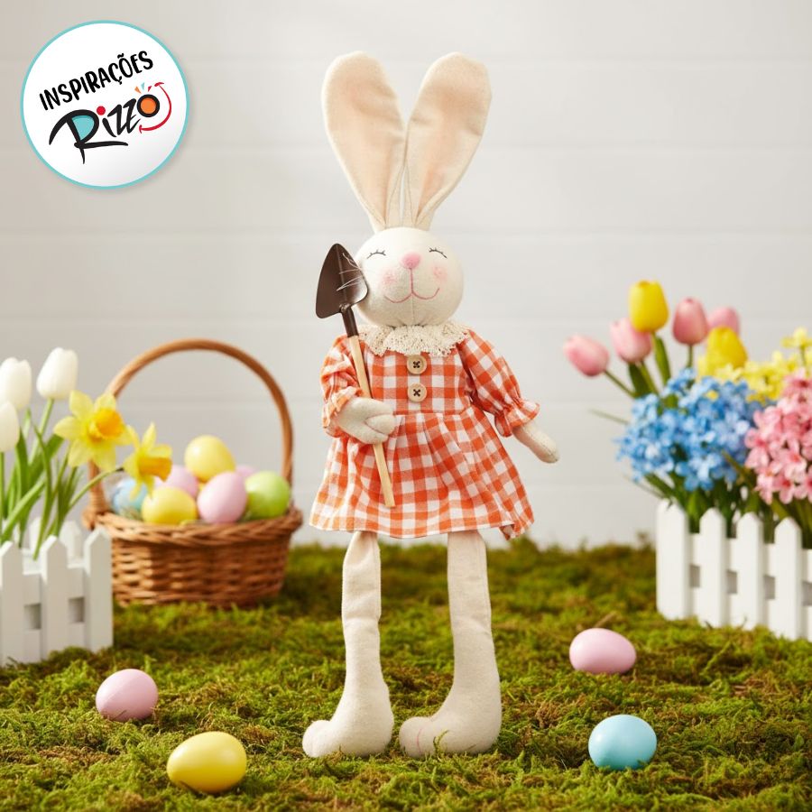 Coloque esta coelha sentada em mesas, aparadores ou em um local de destaque para criar uma atmosfera acolhedora e festiva. O vestido xadrez laranja adiciona um toque vibrante, enquanto a pá completa o tema pascoal com charme e originalidade. A "Coelha Decorativa Sentada com Pá" é uma escolha encantadora para celebrar a Páscoa com estilo e criatividade.