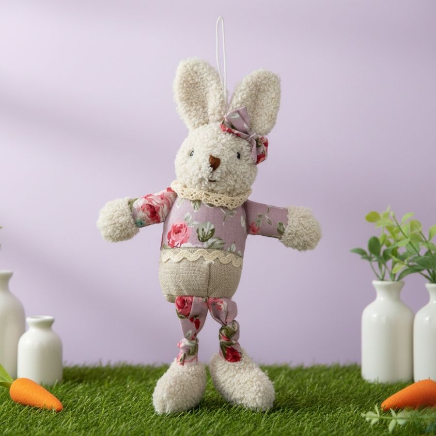 Confeccionada em tecido e vestida com roupa florida em tom lilás, a coelha transmite leveza e um clima primaveril, perfeito para composições decorativas criativas. Possui cordão para pendurar, facilitando o uso em portas, paredes, maçanetas, ganchos, prateleiras ou vitrines temáticas.