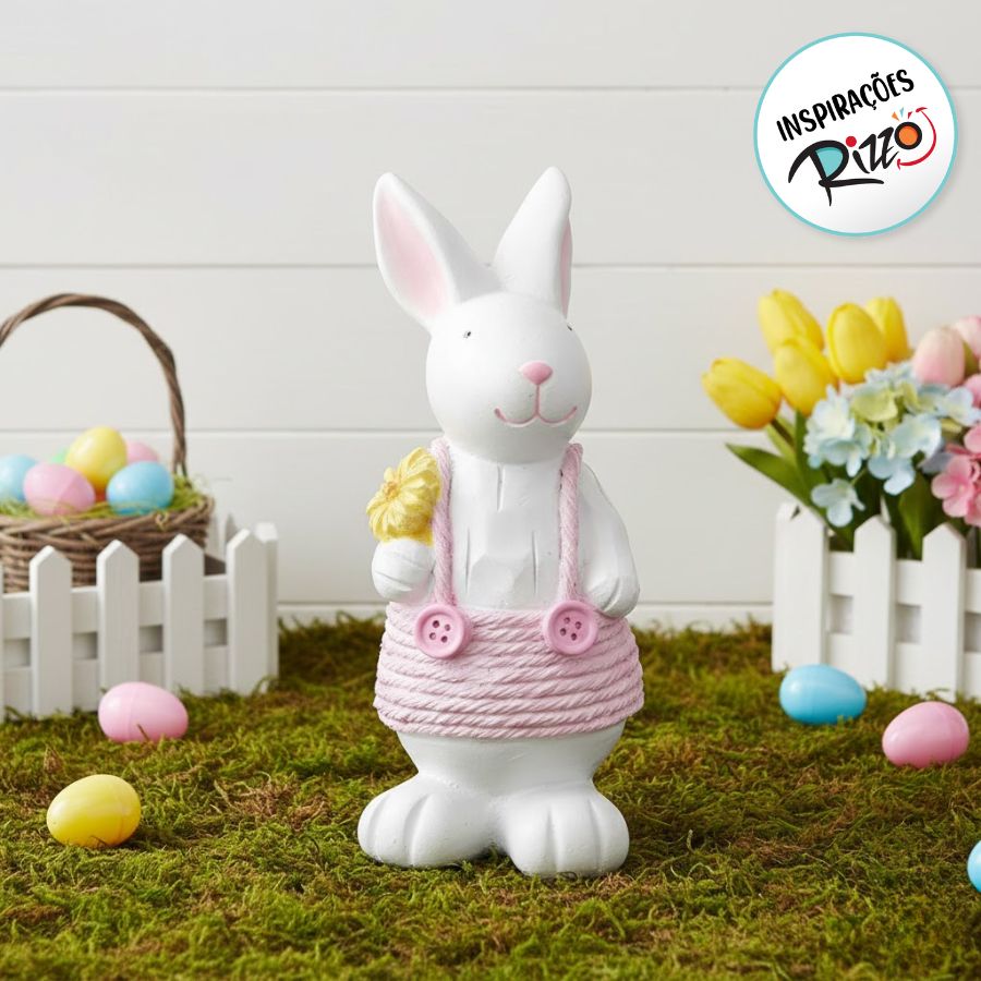 Linda coelhinha de Páscoa no clássico estilo fazendeira ou jardineira! Para você que gosta da modernidade, mas não abre mão de uma decoração mais tradicional, essa coelhinha é a pedida certa!