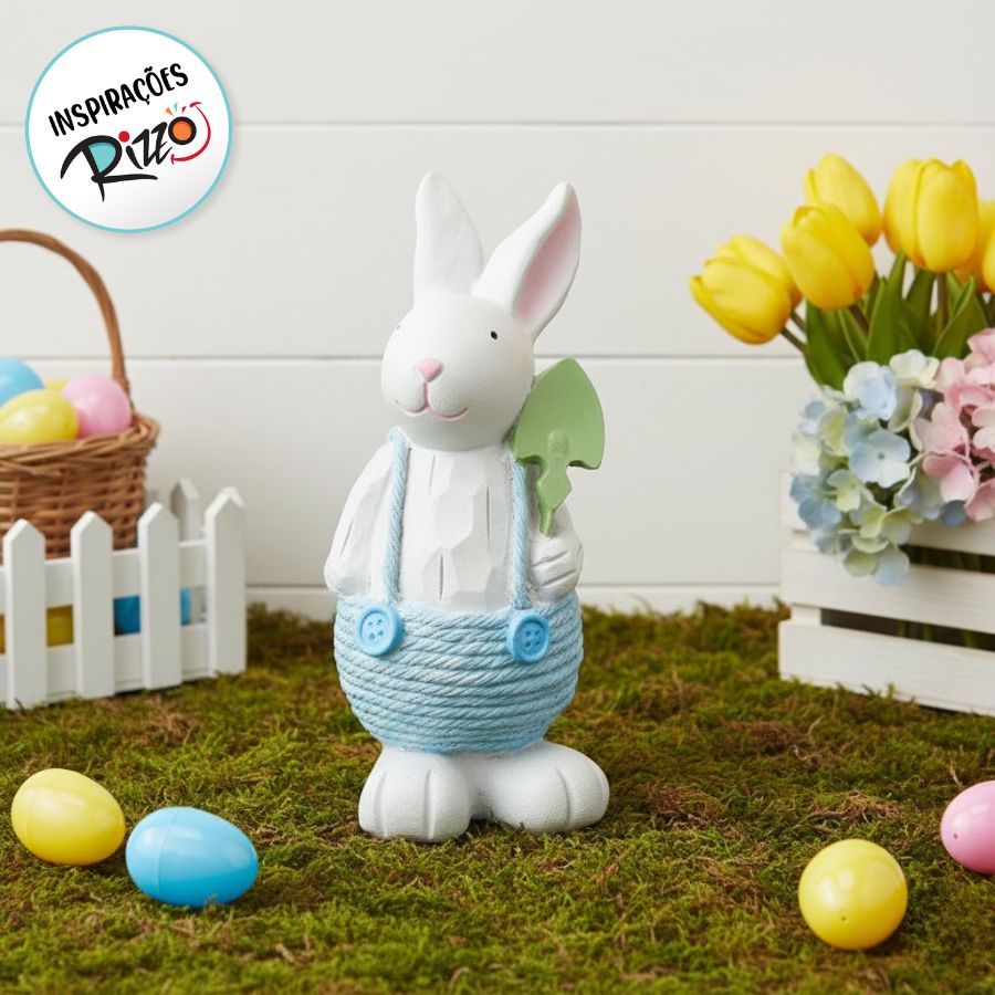 Lindo coelhinho de Páscoa no clássico estilo fazendeiro ou jardineiro! Para você que gosta da modernidade, mas não abre mão de uma decoração mais tradicional, esse coelhinho é a pedida certa!