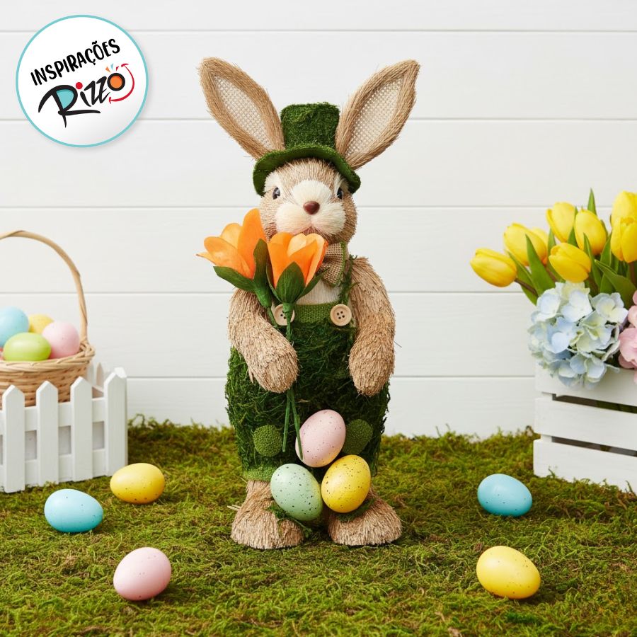 Coelho Decorativo vestido com um macacão e chapéu de musgo e grama