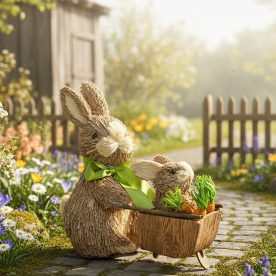 Encante sua decoração de Páscoa com este delicado enfeite de coelhos rústicos com carrinho. A peça traz um coelhinho maior acompanhado de um filhote em um carrinho de madeira, criando uma cena charmosa e cheia de significado.