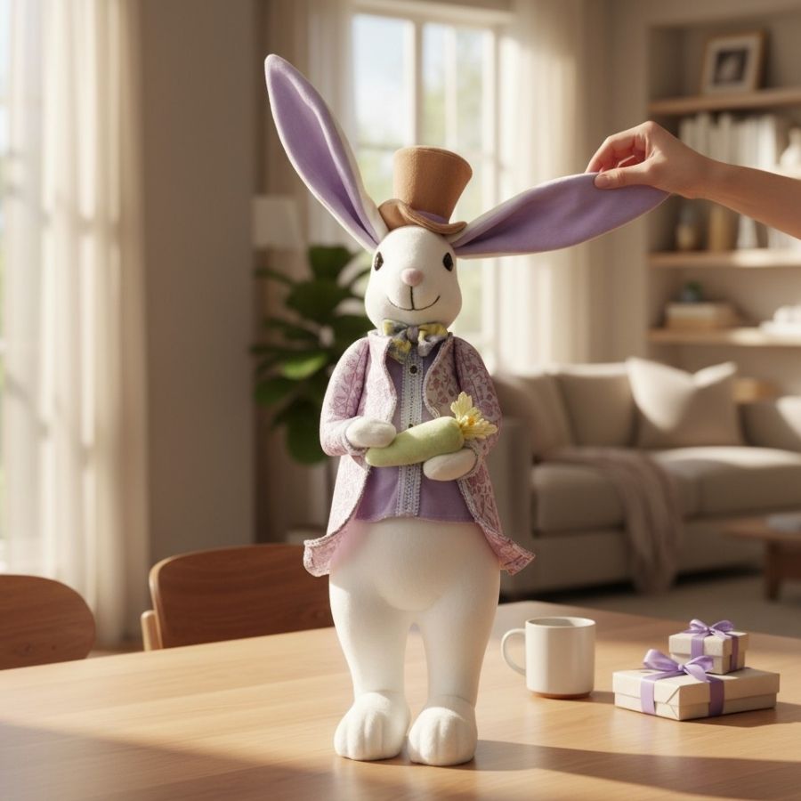 Produzido com materiais de alta qualidade e acabamento refinado, o coelho é resistente, macio e cheio de detalhes, tornando-se uma peça decorativa encantadora e versátil. Com 47cm de altura, é perfeito para composições de médio porte, valorizando decorações pascais com estilo e personalidade.