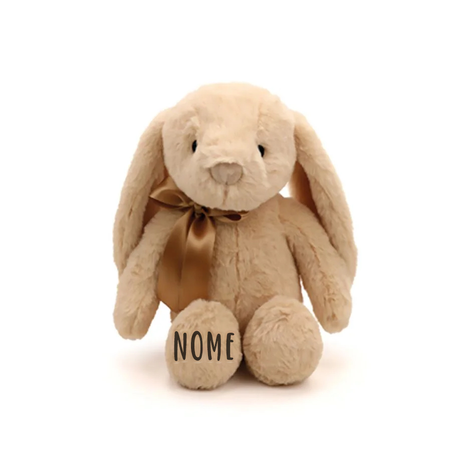 Personalize-o com um nome especial e faça deste coelhinho um presente único e memorável. Com sua pelúcia macia e laço delicado, ele é irresistivelmente fofo e convida a momentos de ternura e felicidade compartilhada.