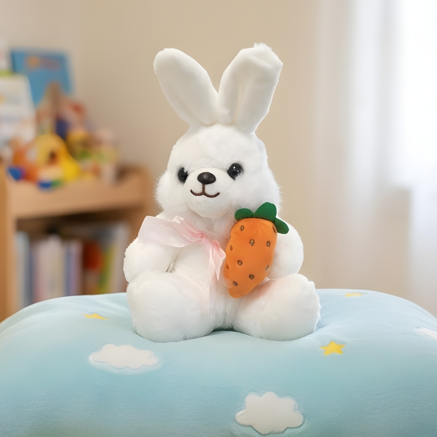 O coelho de pelúcia com laço e cenoura na cor branca possui dimensões aproximadas de 13x20x12cm. Desenvolvido para uso decorativo, é indicado para composições em mesas, aparadores, nichos, vitrines e diferentes ambientações temáticas.