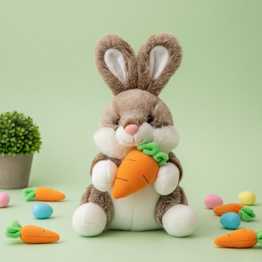 Coelho de pelúcia decorativo de 30 cm, segurando cenoura, ideal para decoração temática, vitrines e composição de presentes com maior destaque visual.