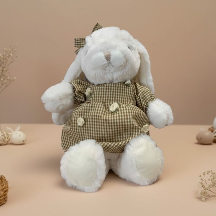 Coelho decorativo de pelúcia branca com vestido xadrez marrom, perfeito para decoração e presentes de Páscoa. Mede aproximadamente 31x23x8cm e une estilo rústico, delicadeza e temática pascal.