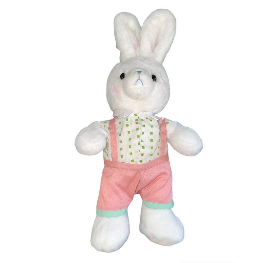 Coelho de pelúcia com jardineira rosa, e uma camisa com vários quadrados verdes estampados