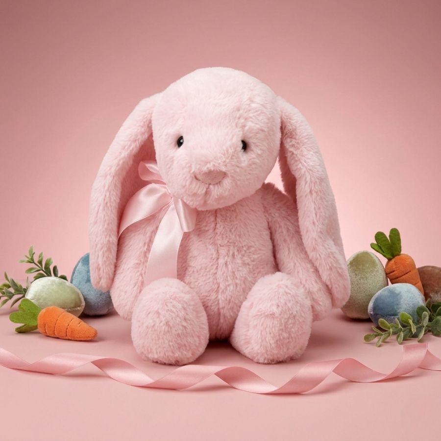 Coelho de pelúcia com laço na cor rosa