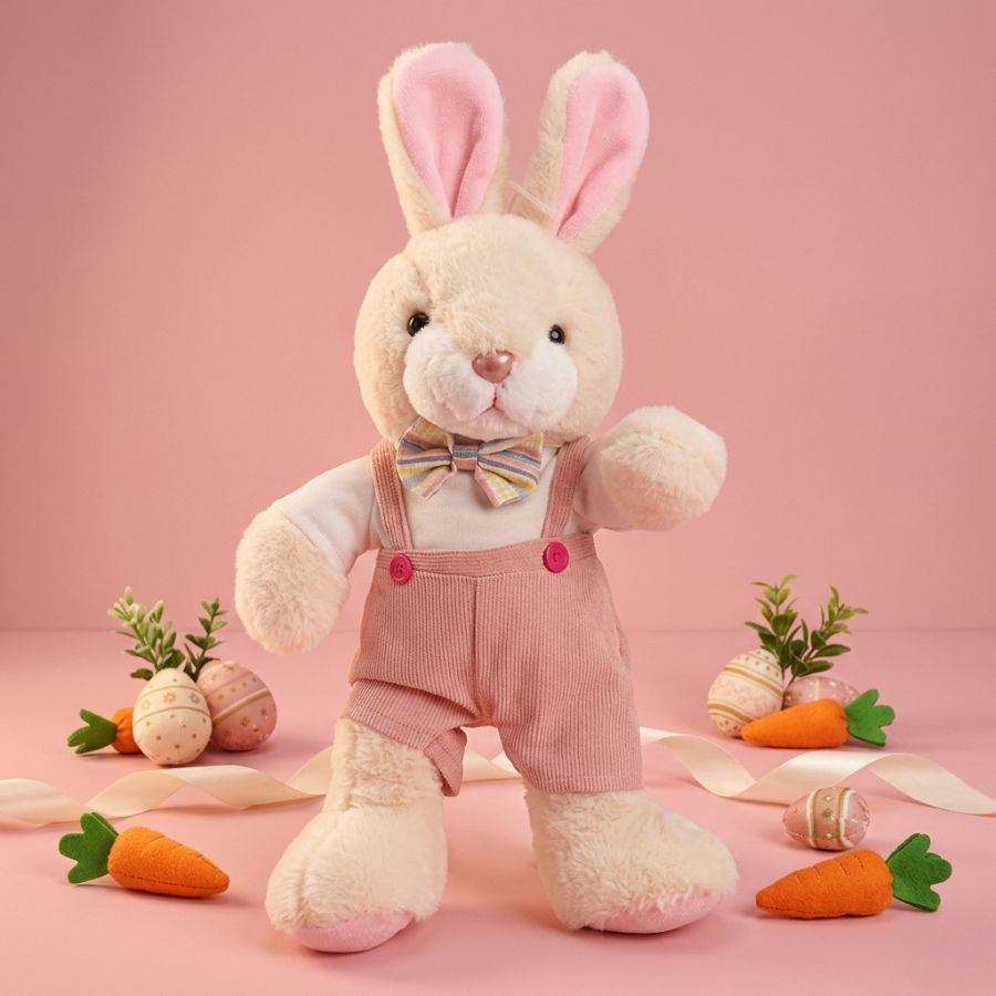 Com sua jardineira rosa, ele transmite uma sensação de delicadeza e charme. Ideal para presentear crianças e adultos, este coelho de pelúcia é perfeito para abraçar e exibir durante toda a temporada festiva.