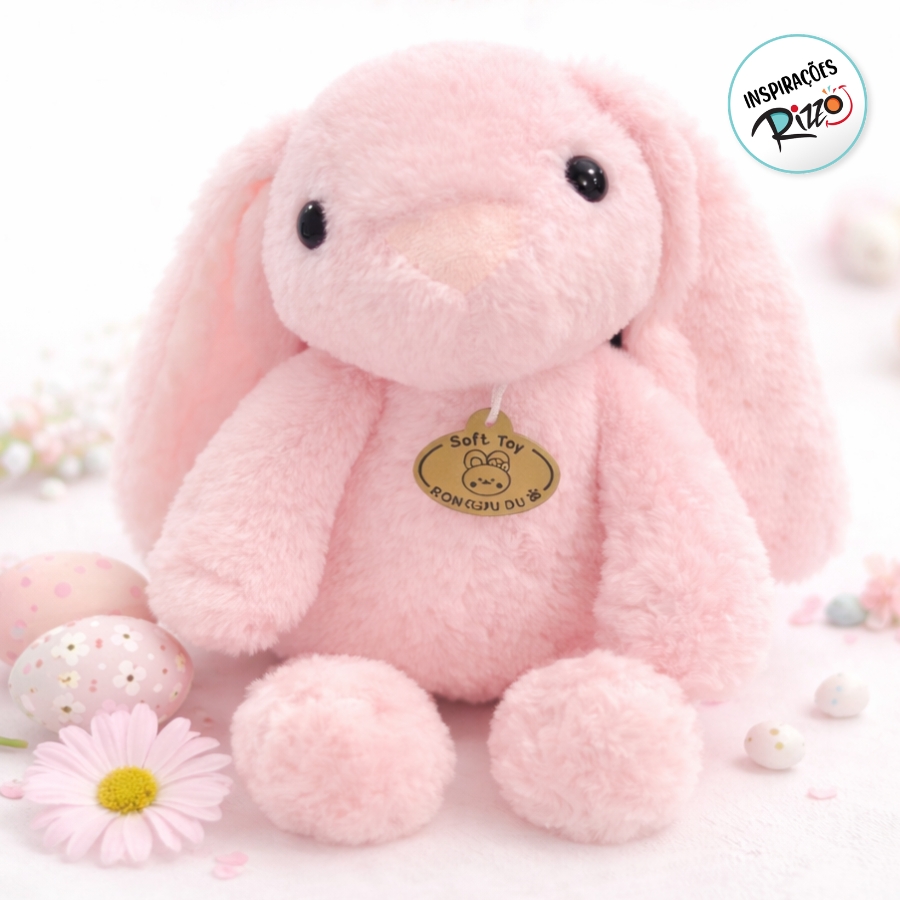 Coelho decorativo de pelúcia rosa com tag ideal para decoração e presentes de Páscoa. Mede aproximadamente 30cm e combina delicadeza, romantismo e charme pascal.