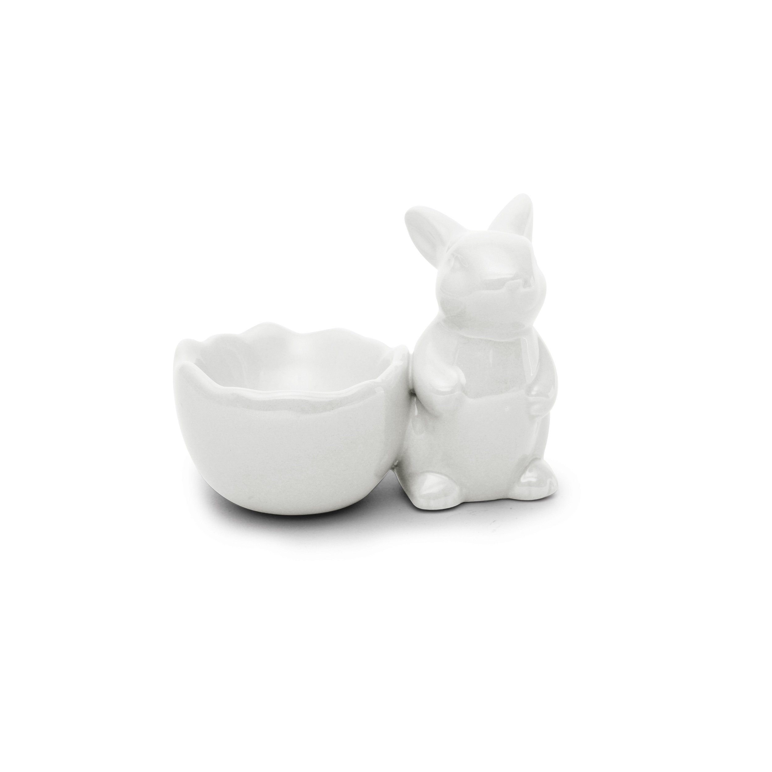 Coelho Decorativo Branco com Meio Ovo em Cerâmica - 5cm x 10cm x 5cm - 1 unidade - Pérola - Cromus Páscoa - Rizzo Embalagens