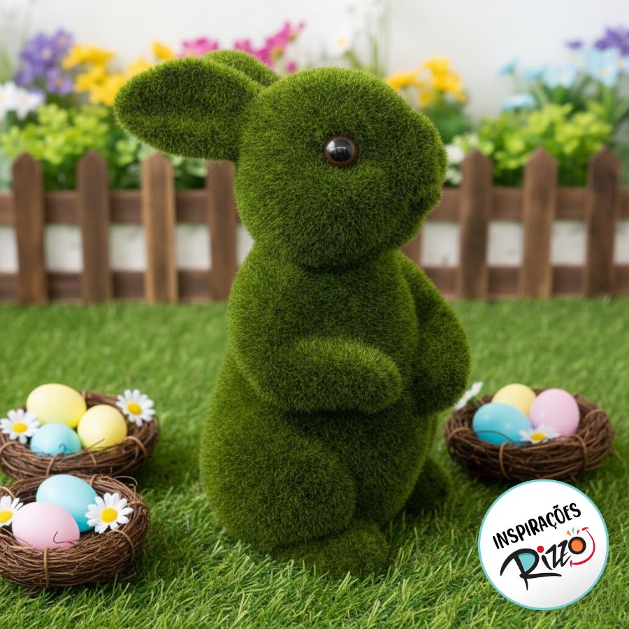Coelho Decorativo feito de isopor coberto por textura que imita grama