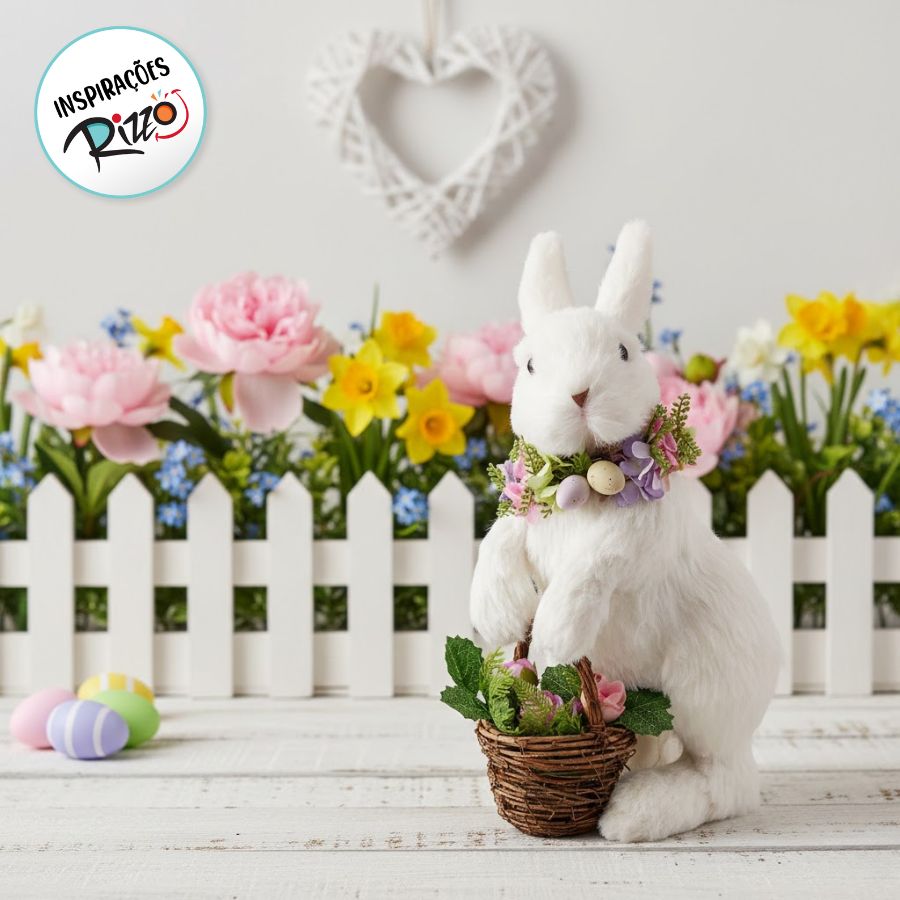 Ideal para decorar mesas, prateleiras ou qualquer espaço que necessite de um toque temático durante a Páscoa, este coelho traz consigo a representação simbólica da renovação e da alegria da temporada. A combinação da cesta de flores e do colar floral cria uma estética suave e festiva, perfeita para celebrar a primavera e a renovação que a Páscoa simboliza. O Coelho em Pé com Cesta de Flores - Páscoa é uma escolha encantadora para iluminar e celebrar esta temporada especial.