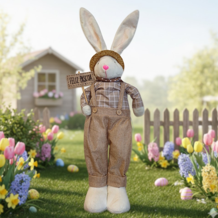 Indicado para decoradores, lojistas, organizadores de eventos e consumidores finais, este coelho decorativo resolve a necessidade de preencher espaços maiores com um elemento temático expressivo. A posição em pé, o acabamento xadrez colorido e a placa decorativa facilitam a composição de decorações de Páscoa completas, sem exigir muitos outros itens decorativos.
