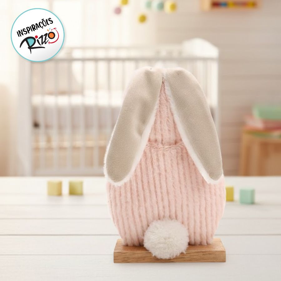 Enfeite de mesa sendo uma silhueta de coelho, com base de madeira felpudo com pelinhos rosa e orelhas brancas pra trás