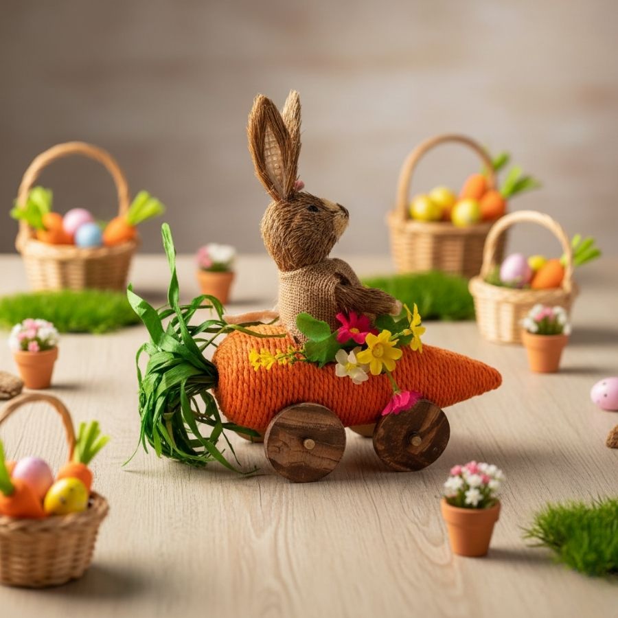 Com cores vibrantes e design detalhado, o Coelho em Carro Cenoura é perfeito para encantar crianças e adultos, criando um ponto focal divertido e alegre. Seu estilo nostálgico e criativo transforma a decoração de Páscoa em algo memorável e cheio de charme.