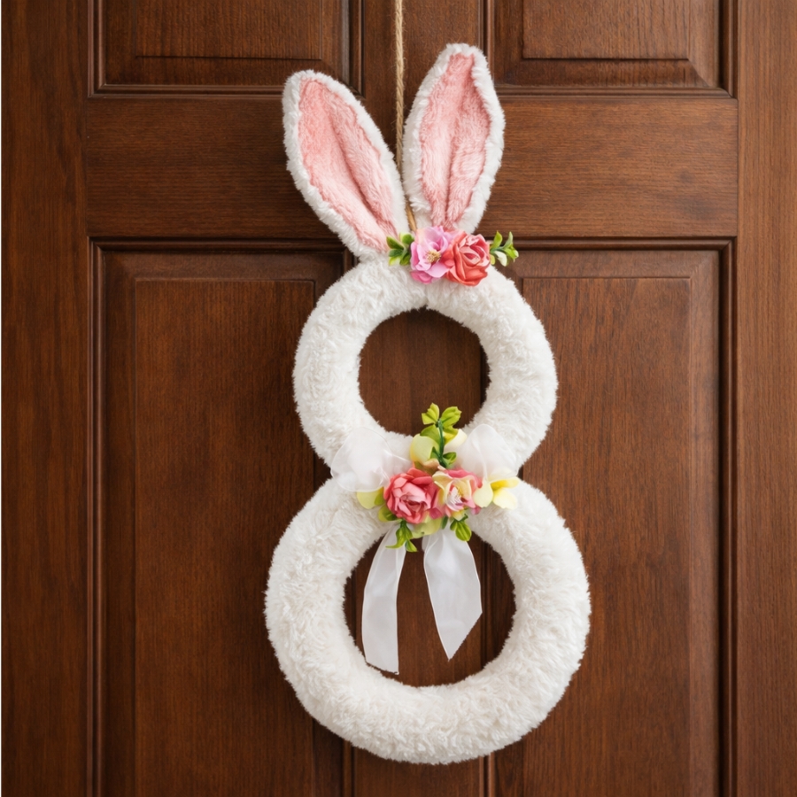 Guirlanda Branca com design de uma silhueta de coelho, felpudo e algumas flores de acompanhamento