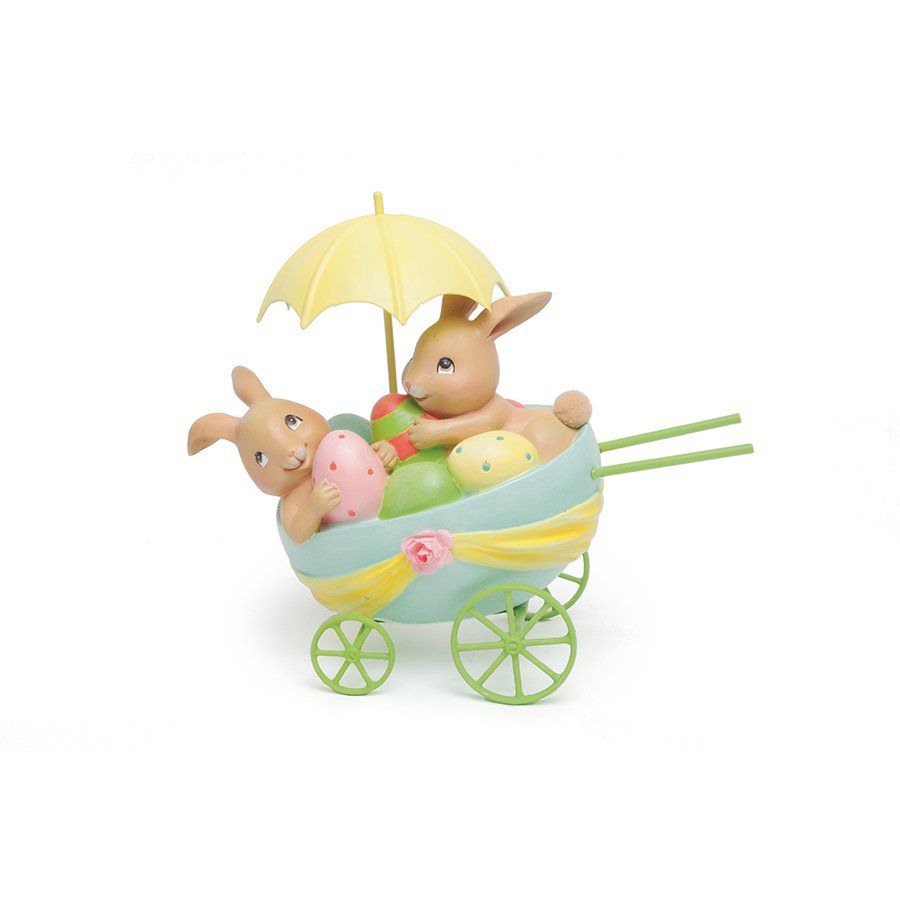 Linda peça em cerâmica mostrando coelhinhos da páscoa se divertindo com ovos de páscoa decorados em um carrinho de mão. Um belo detalhe para qualquer canto.