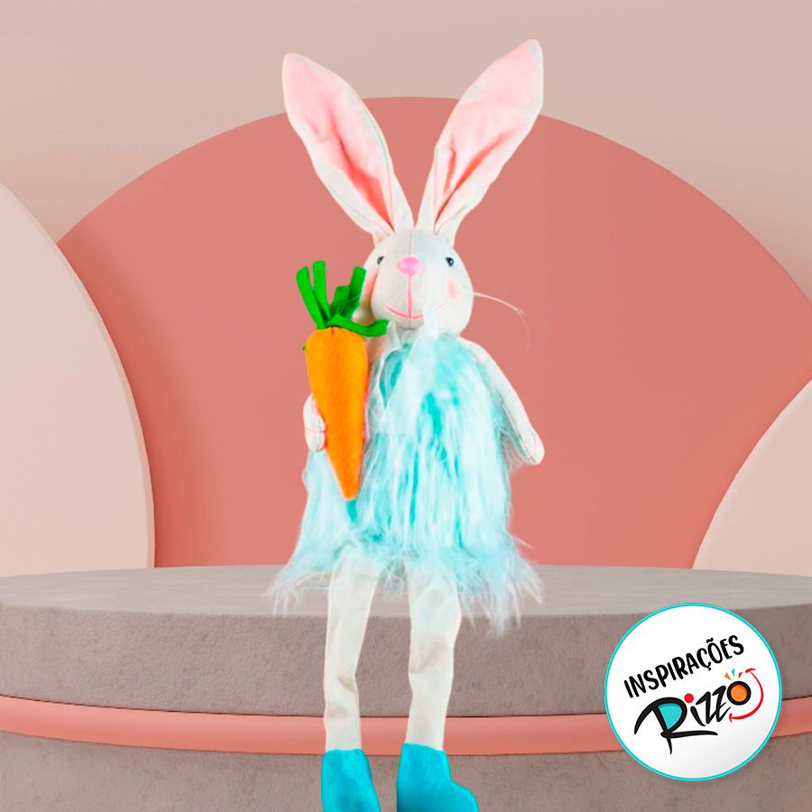 Coelha com pernas de pano, sentado com vestido fulpudo e cor azul ciano, gravata borboleta e cenoura na mão
