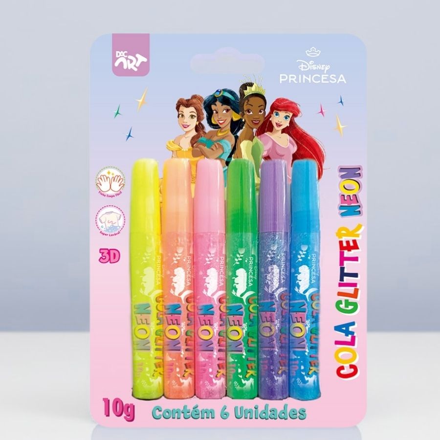 A Cola Glitter Neon – Princesas Disney é um Produto Licenciado Disney criada para deixar desenhos, colagens e trabalhos manuais ainda mais coloridos e cheios de destaque. O conjunto conta com 6 cores de glitter neon que proporcionam um efeito visual intenso, valorizando detalhes e texturas nas criações artísticas. Inspirada no universo encantador das Princesas Disney, a cola glitter neon torna as atividades mais divertidas e envolventes, sendo ideal para uso escolar ou para momentos criativos em casa.