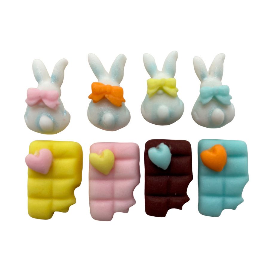 Contem 1 pacote com 4 confeitos no formato de coelho e 4 confeitos no formato de barra de chocolate