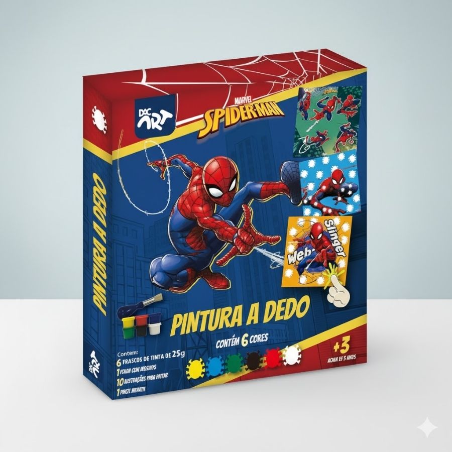 O Conjunto de Pintura a Dedo – Homem Aranha Disney acompanha 6 frascos de tinta com 25g, 1 pincel infantil, 1 folha com adesivos e 10 ilustrações para pintura, oferecendo diferentes possibilidades de uso. As tintas são não tóxicas, super laváveis e certificadas pelo INMETRO, proporcionando mais segurança e praticidade no dia a dia. A técnica de pintura a dedo facilita o manuseio e incentiva a autonomia, enquanto o tema do Homem Aranha Disney deixa cada criação mais divertida, colorida e cheia de aventura.