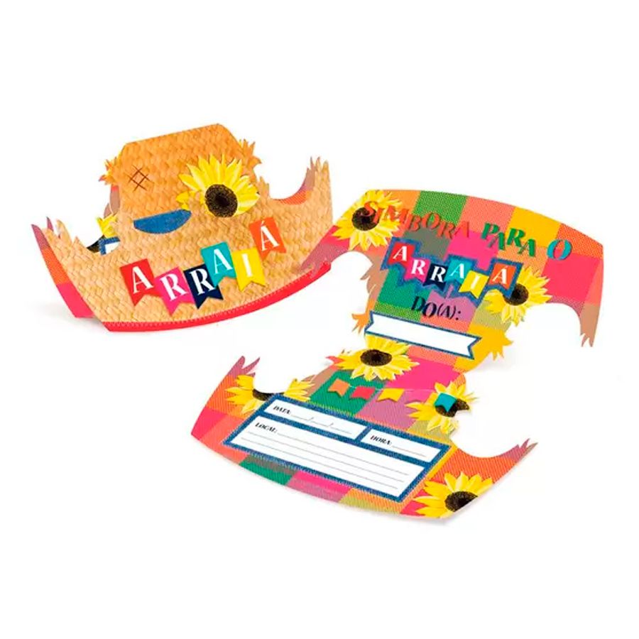 Convite festa junina sortido com tema de arraiá, adornado com ilustração de chapéu.