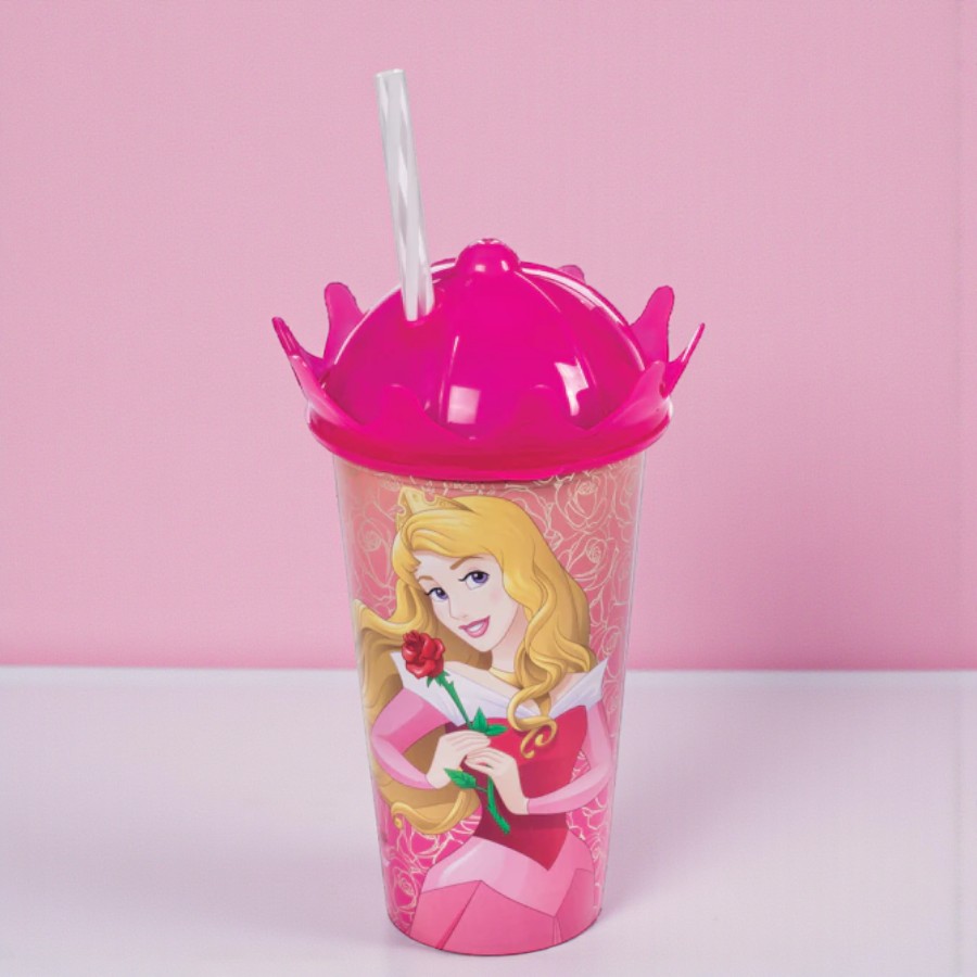 Copo de plástico com canudo e tampa em formato de coroa, inspirado na princesa Aurora Disney