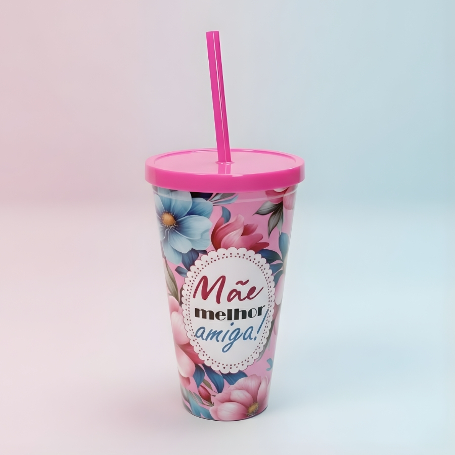 Copo plástico na cor rosa, com capacidade de 600ml. Acompanha tampa e canudo. Possui estampa com a frase “Mãe Melhor Amiga”. Indicado para bebidas frias. Recomenda-se lavar antes do primeiro uso. Não utilizar em micro-ondas ou com líquidos muito quentes, salvo orientação diferente na embalagem do fabricante. Para preservar a estampa, evitar o uso de esponjas abrasivas e produtos químicos agressivos. Consultar o rótulo para informações adicionais sobre material, resistência térmica e conservação.