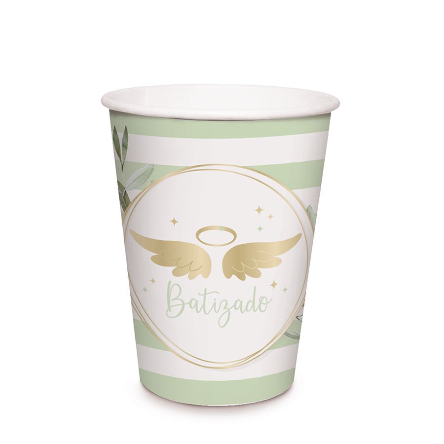 Utilize os Copos de Papel 240ml Festa Batizado 2 para colocar na mesa de comes e bebes ou na mesa principal para completar a decoração.