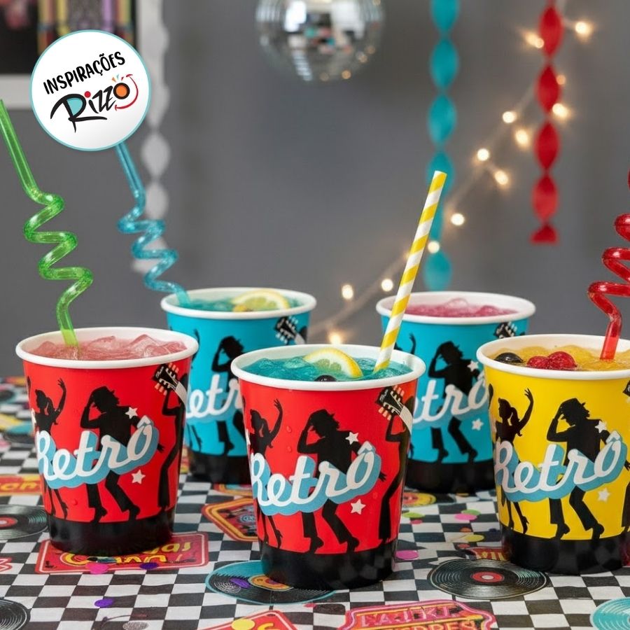 Utilize o copo para servir bebidas frias durante a festa. Combine com pratos, guardanapos e outros itens da linha Festa Retrô para uma decoração completa e temática.