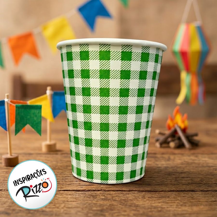 Copo de papel descartável com estampa xadrez, ideal para servir bebidas e completar a decoração em festas juninas.