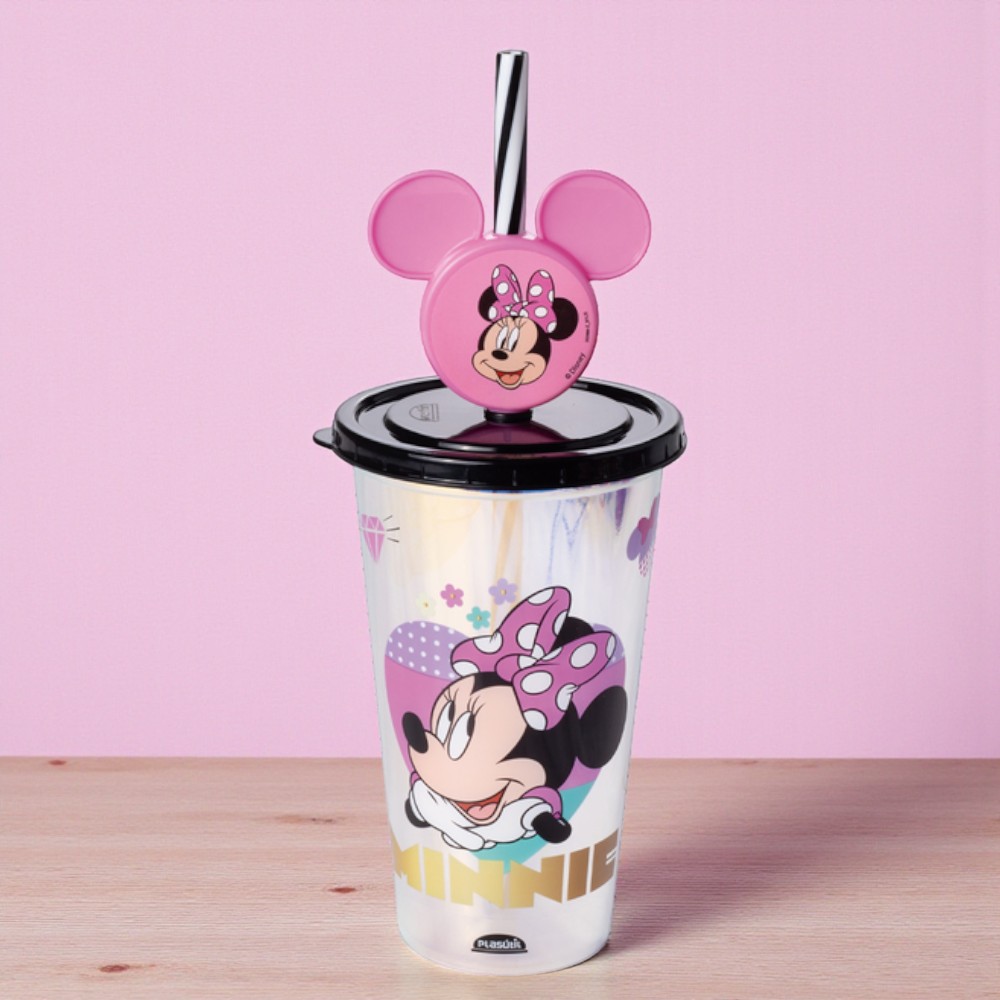 Copo com tampa e canudo, inspirado em Minnie Mouse Disney. Produto Licenciado.