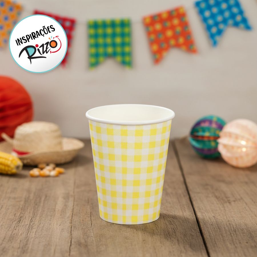 Copo de papel Biodegradável Xadrez - Amarelo - Festa Junina - 270ml - 10 unidades - Rizzo