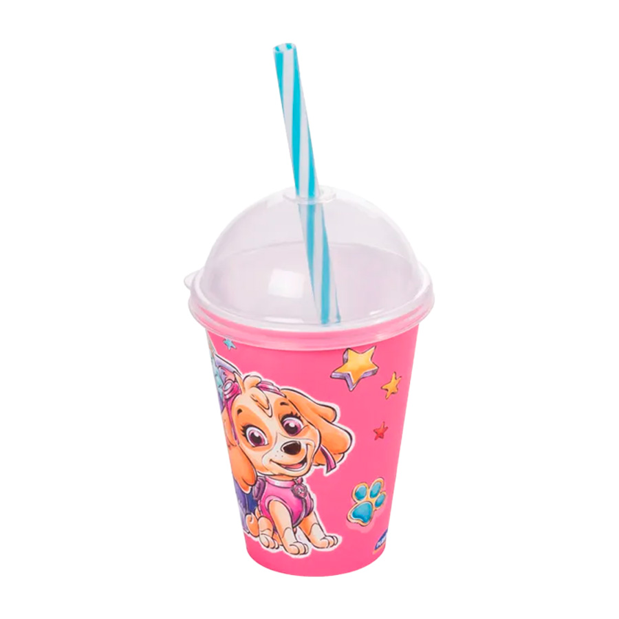 Mini copo de plástico com capacidade de 280ml, acompanhado por uma tampa em formato de meia esfera e canudo. Possui estampa temática da Patrulha Canina com fundo rosa.