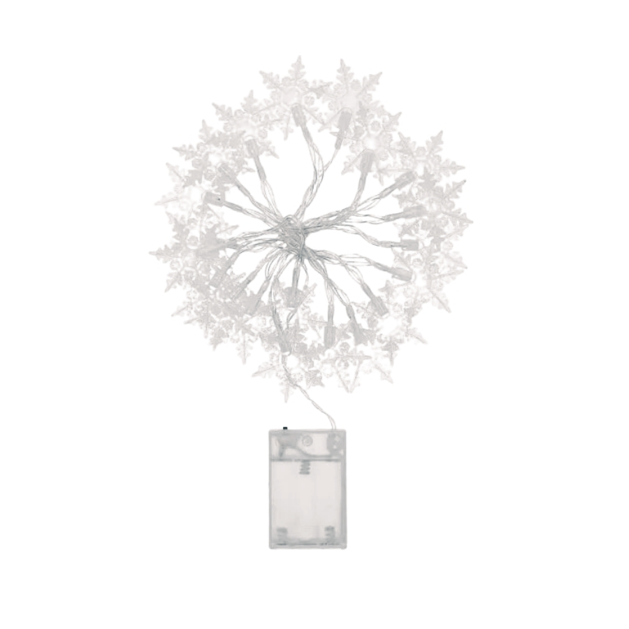 O Cordão de LED Luz Branca com Fio Incolor é uma iluminação decorativa elegante para o Natal, ideal para criar um ambiente festivo e sofisticado com seu design delicado de flocos de neve. Requer 3 pilhas do modelo AA, que não estão inclusas.