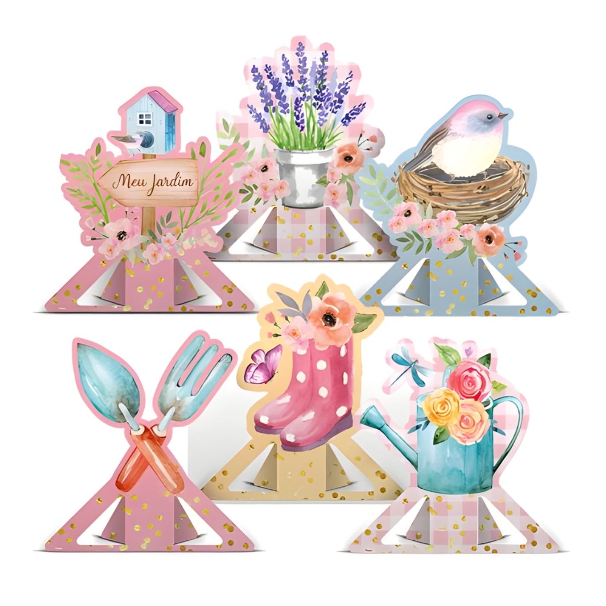 Monte as decorações sobre a mesa principal, junto aos doces e lembrancinhas, ou distribua pelas mesas dos convidados. Também podem ser inseridas em arranjos florais, vasos ou bases decorativas para completar o cenário do tema “Meu Jardim”. Combine com outros itens da mesma linha para um visual ainda mais encantador.
