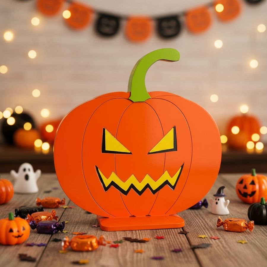 O Display de Mesa em MDF Abóbora Laranja 26x25,5cm é versátil, resistente e ideal para compor decorações criativas de Halloween em mesas, festas e vitrines.