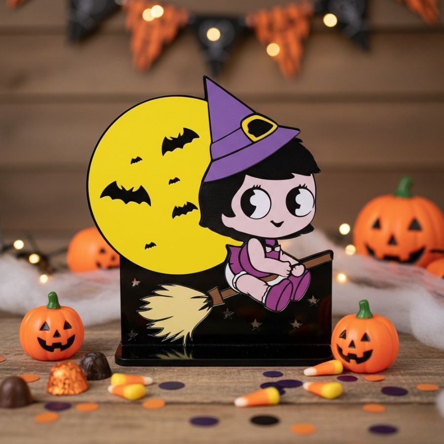 O Display de Mesa em MDF Bruxinha Roxo 20x23x8cm é resistente, versátil e ideal para decorar mesas, festas e ambientes de Halloween com charme e diversão.