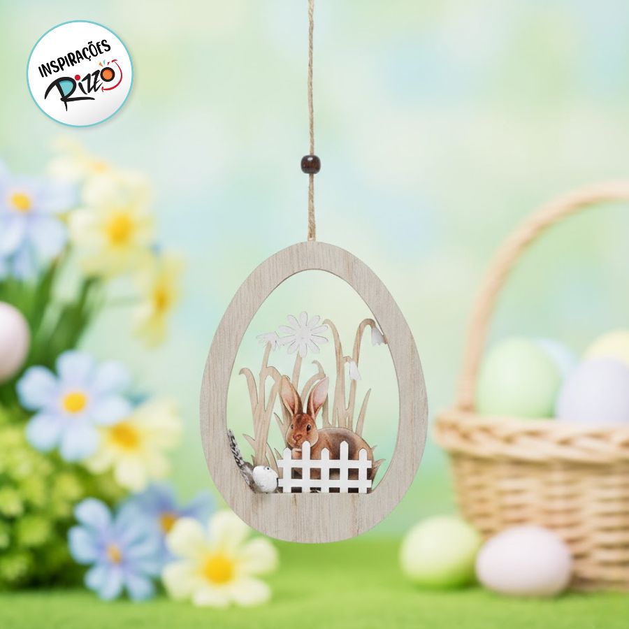Enfeite de Páscoa trabalhado em madeira. É uma graça! E você pode pendurá-lo onde quiser: na porta, na parede e, por que não, numa árvore para dar uma alegrada em seu ambiente!