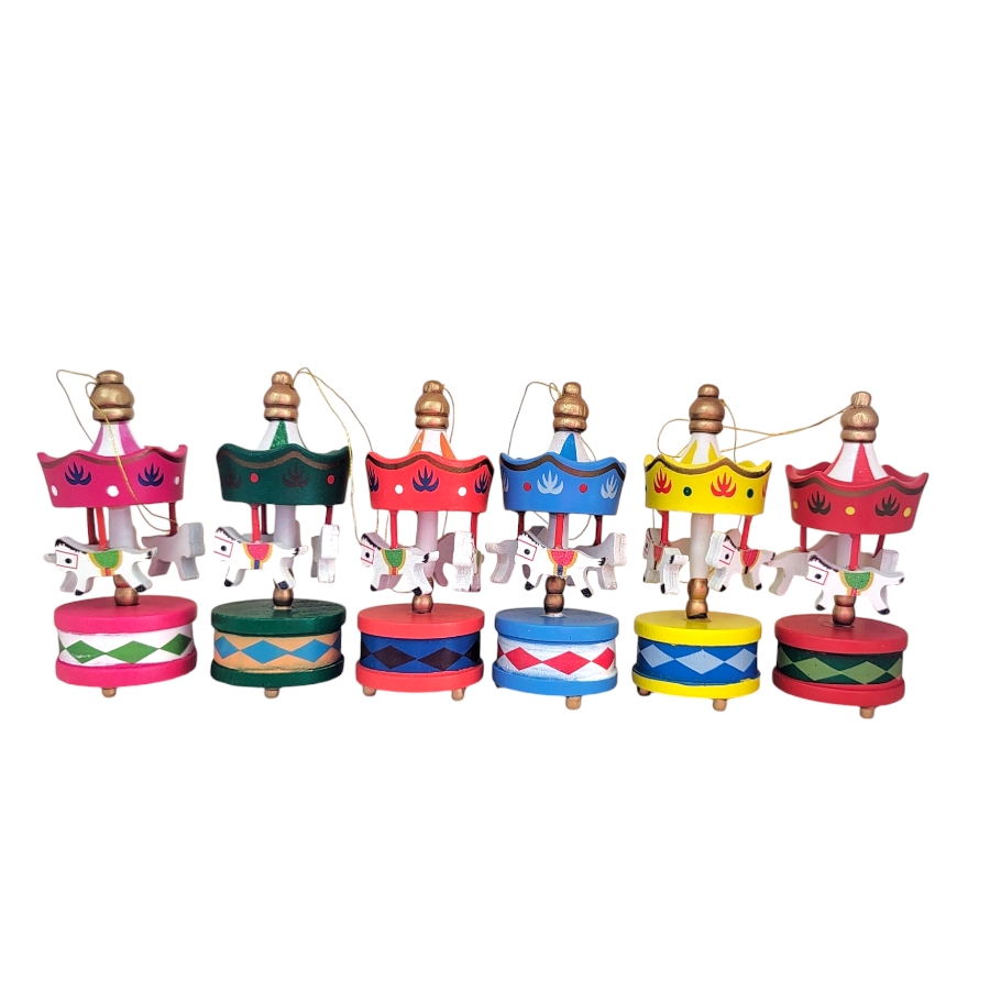 O Kit Mini Carrossel para Pendurar - 8cm em cores vibrantes é um enfeite que traz movimento e encanto. Ideal para árvores de Natal ou guirlandas. Dica: Utilize-o em conjunto com outros enfeites de madeira para criar uma estética nostálgica e tradicional na sua árvore de Natal.