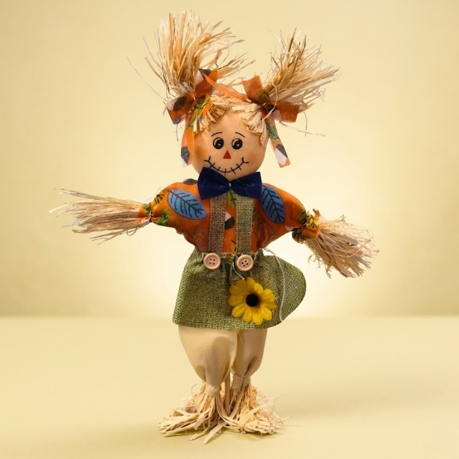 Enfeite decorativo em formato de espantalho menina com base. Possui dimensões aproximadas de 12cm de largura, 33cm de altura e 5cm de profundidade. Indicado exclusivamente para uso decorativo. Recomenda-se manter em local seco e evitar contato com umidade ou líquidos para preservar a integridade do produto.