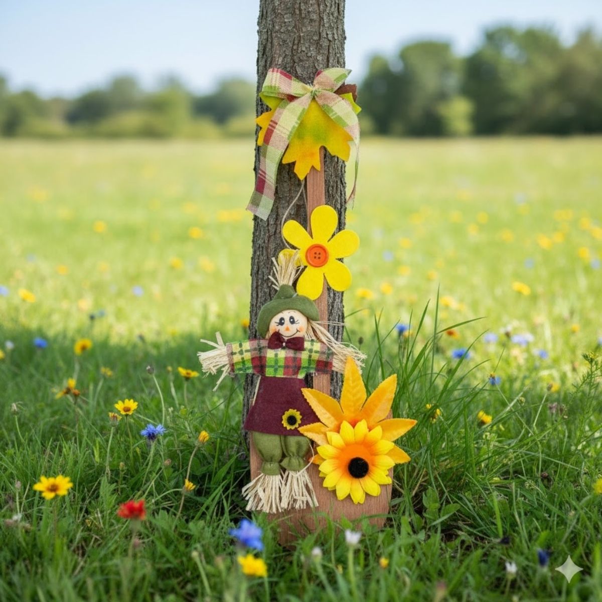 O Enfeite Decorativo de Festa Junina no modelo vaso com espantalho é uma peça charmosa e cheia de detalhes para compor a decoração típica junina. Apesar do nome, o formato lembra mais a silhueta de um vaso, trazendo um visual decorativo diferenciado, enriquecido com flores amarelas aplicadas, um laço decorativo e uma espantalha ricamente detalhada.