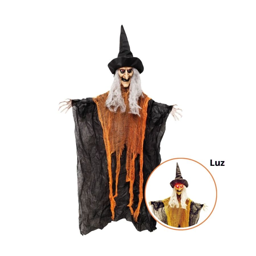 Enfeite de Halloween com luz em formato de bruxa. Mede 90x20cm e é ideal para decoração iluminada em ambientes internos ou externos.
